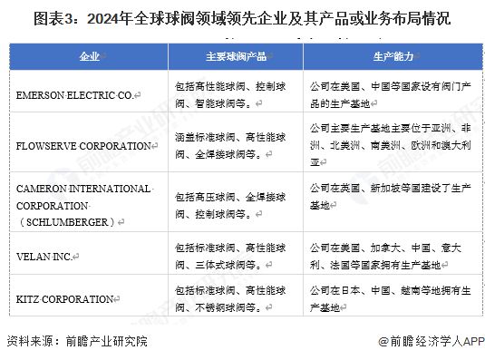 目前,全球代表性球阀生产企业包括Emerson、Flowserve、Cameron、Velan等企业,提供标准球阀、高性能球阀、控制球阀、智能球阀等产品。这些企业在全球多个国家拥有生产基地,能够保证产品的供应。