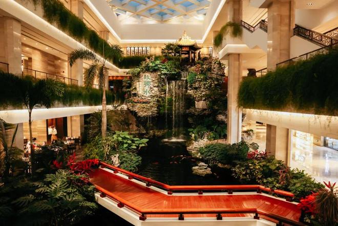 会议全程在广州白天鹅宾馆举办,抵达大堂的那一刻,映入眼帘的是8米高的“故乡水”瀑布从英石假山间倾泻而下,水花溅起细碎的声响,金瓦濯月亭静立潭边,锦鲤在清浅水中悠游穿梭,环绕的岭南绿植透着蓬勃绿意,“别来此处最萦牵”勒石崖壁,字里行间藏着绵长的乡愁。