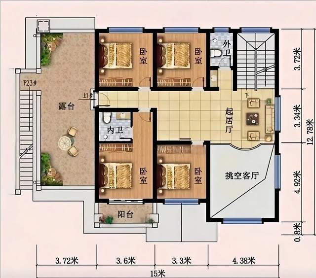 别墅的二楼居住区,四间卧室各具特色,安静而私密,亲朋好友来了都住得下,也为家人提供了充足的居住空间,一间超大主卧自带内卫和阳台设计,既方便又舒适。楼梯上来就是起居室,可以俯瞰楼下客厅全景;左边是宽敞的大露台,在这里可以放松身心,享受悠闲的时光,还可以举办露天派对,或者只是静静地欣赏乡村的美景,享受生活的美好。