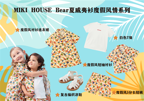 充满夏日气息的MIKI HOUSE Bear图案设计的连衣裙,短袖衬衫和5分长短裤,与夏日缤纷色彩呼应,生动活泼;良好触感、自带光泽的材质,舒适又显气质。椰子风的纽扣渲染度假气氛,连衣裙和短袖衬衫无论是单穿还是内搭素色T恤都能变身时尚潮童,赚足回头率。女生再搭配一双复古编织凉鞋,既舒适又时尚,分分钟留下海边大片!